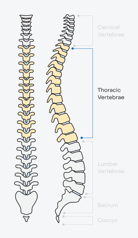 - Thoracic spine (the back): The twelve vertebrae of the mid-back that are attached to your ribs.