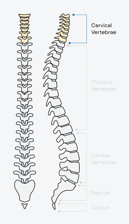 - Cervical spine (the neck): The first seven vertebrae at the top of the spine.