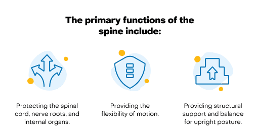 The spine performs numerous functions in the body, but some of the primary functions include: